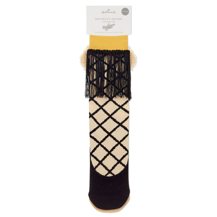 Celebrate the season with socks as unique as you are. Inspired by "A Christmas Story," these mismatched novelty socks will shine a light on your impeccable fashion sense. One sock features the iconic leg lamp, complete with stiletto toe, fishnet stocking details and a fringed lampshade cuff. The other sock resembles the stamped wooden crate it arrived in, topped with fabric "straw" accents and the word "Fragile" stamped along the front. Together, they’re a perfect tribute to Mr. Parker's Major Award. Slip them on and let your feet do the standing in for holiday fun.