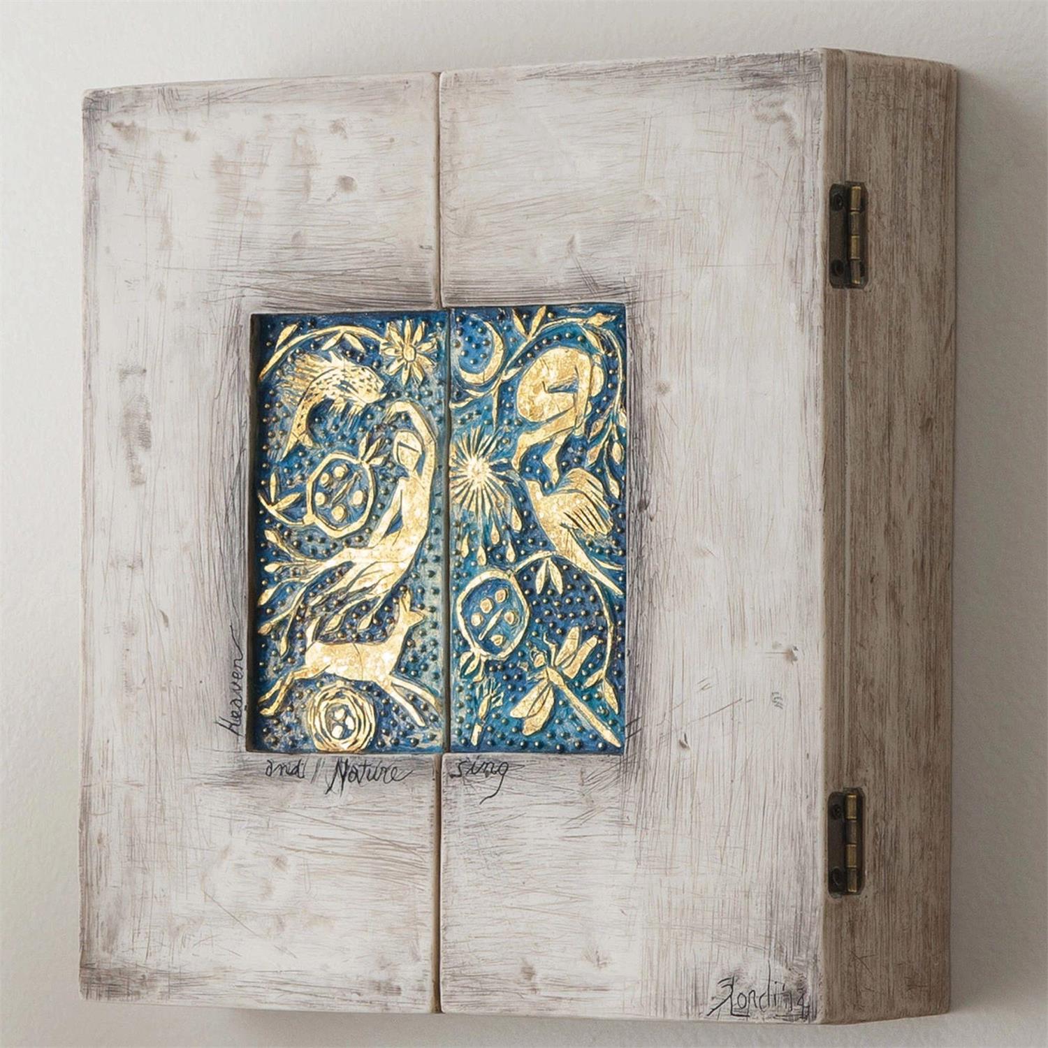 Starry Night Nativity 8.5 sq x 2 d; Weighs apprx 5.5 pounds And heaven and nature sing Hinged resin box; applied gold leaf. Can be hung on the wall or free standing. 2 Keyholes for hanging.