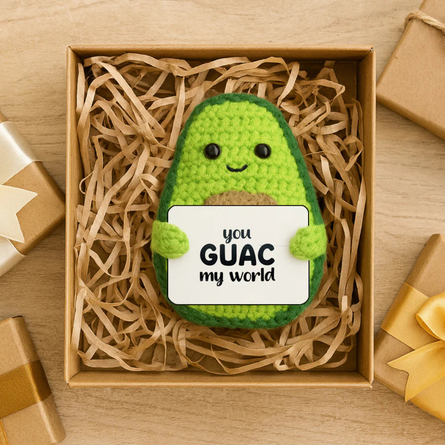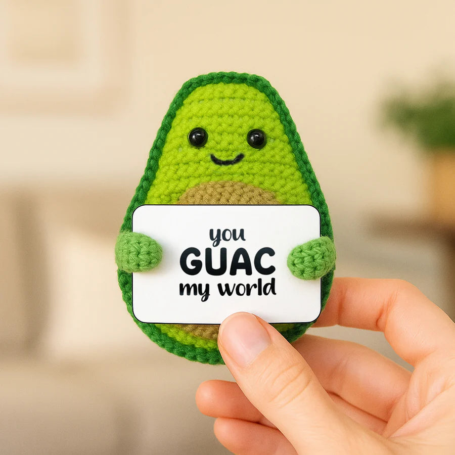 • IN-HOUSE DESIGN: Holding a stitched sign that reads, “You GUAC my world,” this avocado wears its brown pit proudly and features two-toned greens to create dimension. With tiny arms and stitched cheeks, it's an adorable blend of wholesome and hilarious.