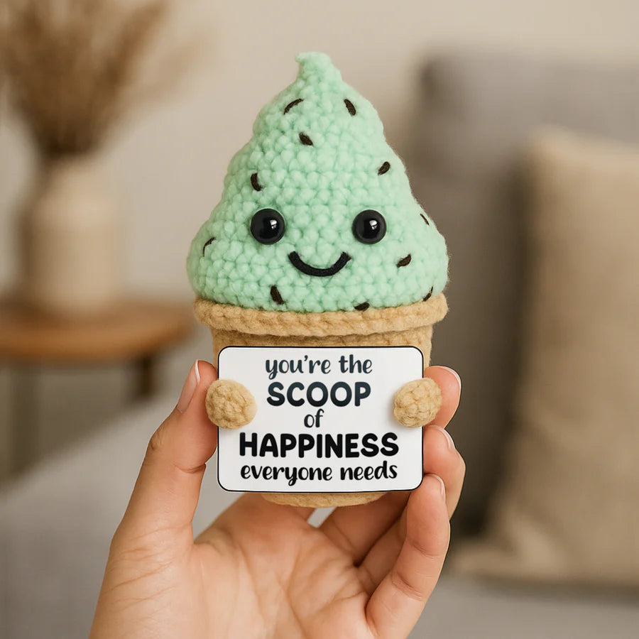- IN-HOUSE DESIGN: This smiling ice cream holds a sign that reads, “You’re the SCOOP of HAPPINESS everyone needs.” From the swirled top to the waffle cone bottom, every detail is sweetly stitched for flavor and fun.
