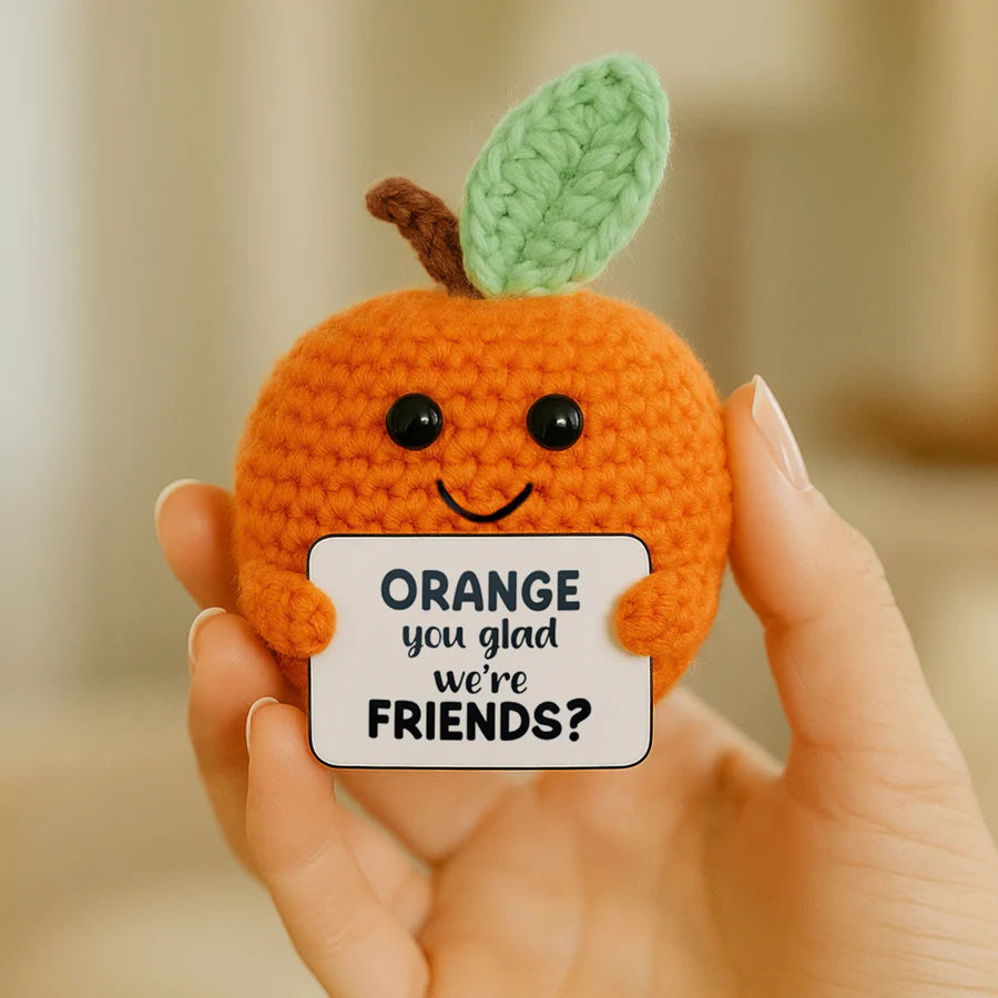 - IN-HOUSE DESIGN: This cheery citrus holds a sign that says, “ORANGE you glad we’re FRIENDS?” Its sweet smile, felt leaf, and blushed cheeks give it undeniable charm. The sentiment is a playful pun and heartfelt expression of friendship all rolled into one.