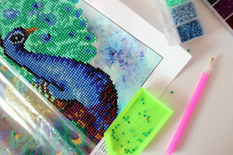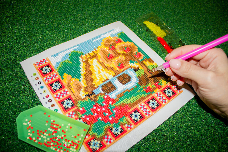 Each kit comes with Diamond Dotz which are facet-shaped plastic pieces with a flat, adhesive back. The design of your picture is printed on the 100% polyester fabric canvas and easy to read. You first dip the stylus into the wax, pick up one of the Dotz, and press to seal it onto the fabric by its adhesive back. It is that easy! As you place colourful, sticky Diamond Dotz over their correlating colour on the piece of fabric, your painting comes to life in front of your eyes.