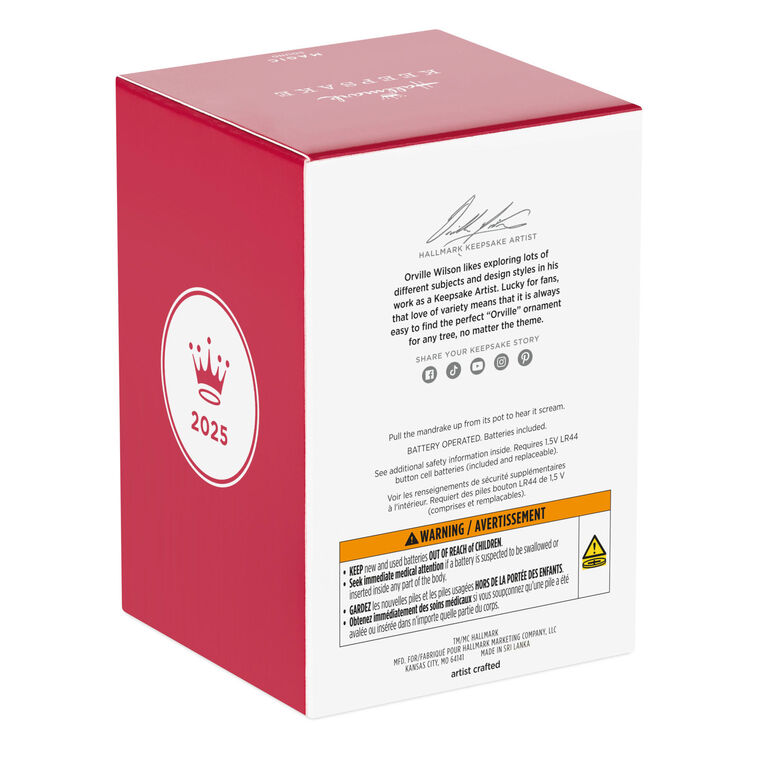 As Harry, Ron and Hermione learned in their Hogwarts second-year Herbology class with Professor Sprout, the Mandrake plant is an essential ingredient in antidotes for people afflicted by certain curses. But with a root that resembles a human form, it can be dangerous, too. Pull up on the plant stem nestled in the terra-cotta-style pot of this Christmas tree ornament to hear the Mandrake cry—a scream that can be fatal in the Wizarding World! Battery operated.