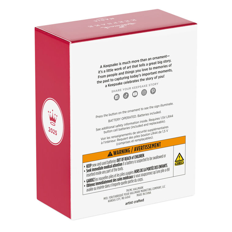 It's show time! Summon memories of the hilarious horror-comedy movie "Beetlejuice" with this Christmas tree ornament featuring the headstone that marks the graveyard residence of the afterlife's foremost bio-exorcist. Press the button to light up his obnoxious marquee sign and make sure everyone knows where to find the ghost with the most. Battery operated.