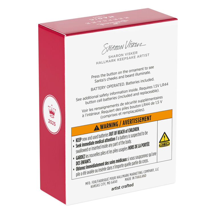 Add a touch of jolly ol' charm to your holiday decor with this fun Christmas tree ornament. The nostalgic design features a throwback Santa face decoration in a retro-inspired box. Press the button to see Santa's rosy cheeks and lush beard light up. Battery operated.