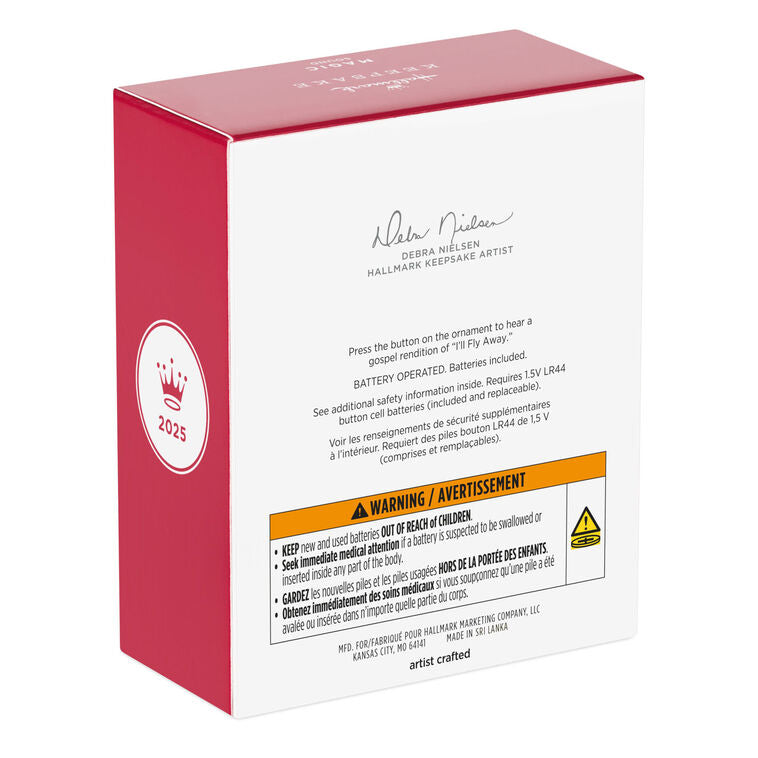 Bring the sounds of the season to your tree with this musical Christmas tree ornament. The classic upright piano features gold holly accents and tinsel garland attachment. For an extra dose of cheer, it plays an inspiring gospel choir performance of the timeless hymn “I’ll Fly Away.” Battery operated.