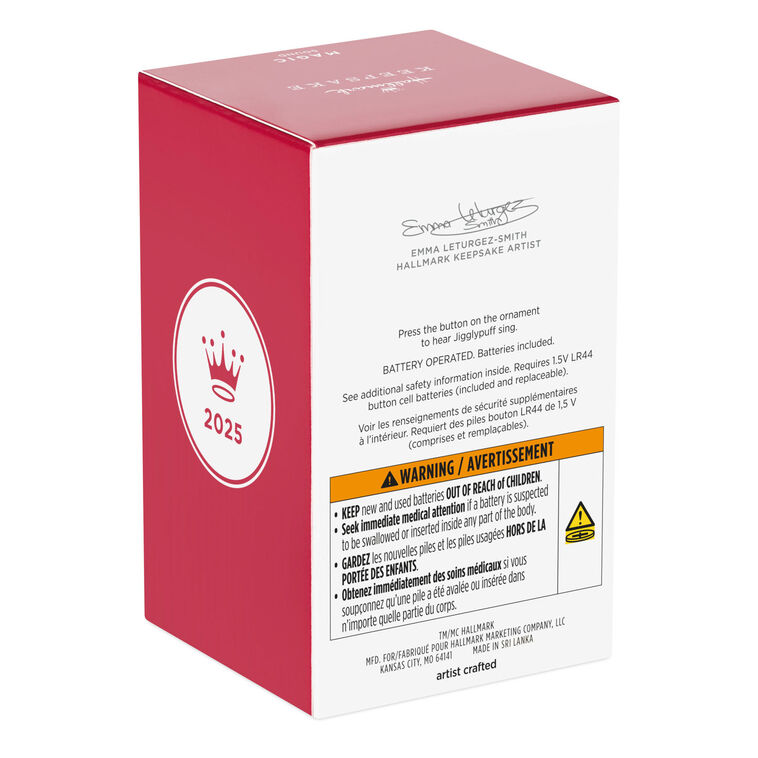 Give a Pokémon fan a reason to smile with this sweet Christmas tree ornament of Jigglypuff, the pink, round Pokémon beloved by trainers and known for its lovely singing. Press the button on the base of the ornament to hear the character from the Pokémon animated series sing into a green-tipped microphone. Battery operated.