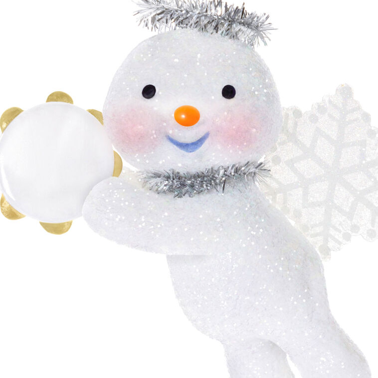 Add an angelic touch to your holiday decorating with this cute little angel snowman Christmas tree ornament. With rosy cheeks, a tinsel halo and delicate snowflake wings, this glittery snow angel holding a tambourine is truly a divine darling.