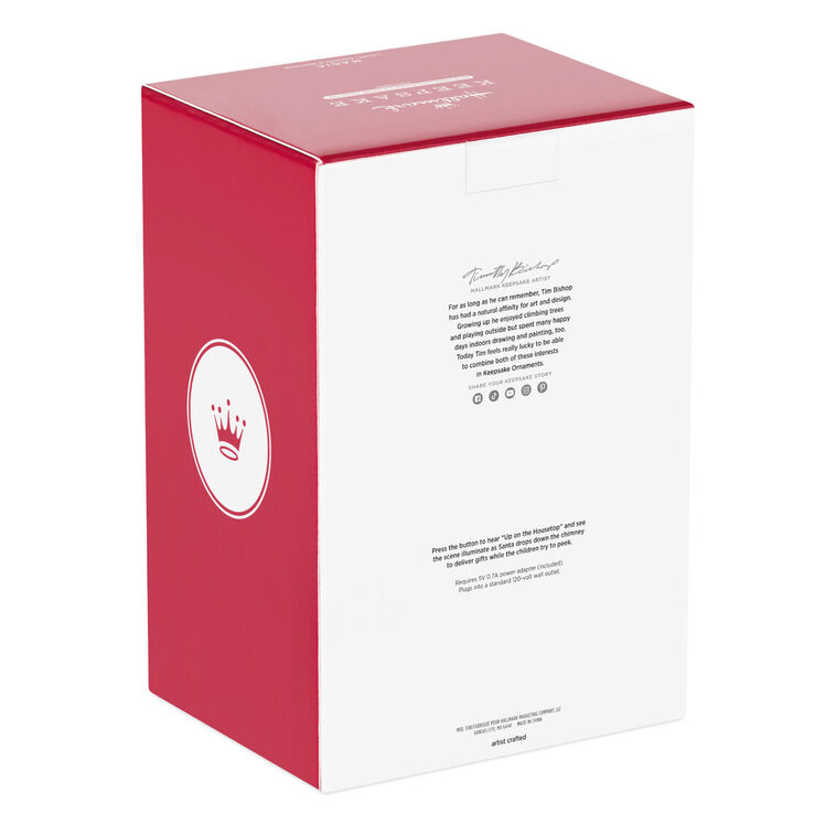 The pitter-patter of reindeer hooves on the roof has stirred the little ones in the house, eager to see if they can catch a glimpse of the jolly ol' elf in action. Enjoy the anticipation and excitement of Santa's Christmas Eve visit with this fun tabletop decoration. Connect to the included power adapter to see a continuous light effect. Press the button to see a light show, hear music from "Up On the Housetop" and watch as Santa drops down the chimney to deliver gifts while the children try to peek.