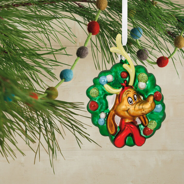 Celebrate the family tradition of the Dr. Seuss classic “How the Grinch Stole Christmas!” This premium blown glass Christmas tree ornament of Grinch's loyal dog companion Max, in a Christmas wreath and wearing a reindeer antler, is a fun addition to your holiday decor that will delight all the Whos in your home, the tall and the small.