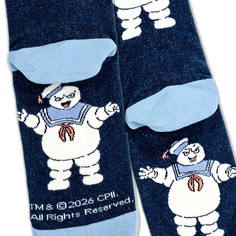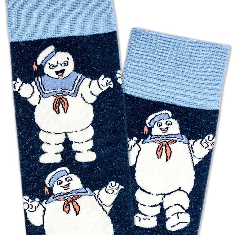 Step into sticky supernatural goodness with these Ghostbusters novelty crew socks featuring the Stay Puft Marshmallow Man. Inspired by the sweetest villain from the '80s, this set of navy blue socks captures his jovial and angry expressions as he stomps through the streets of Manhattan. These socks are perfect for fans of paranormal pop culture and '80s movie magic and will show off your fandom in ghost-toasty style.