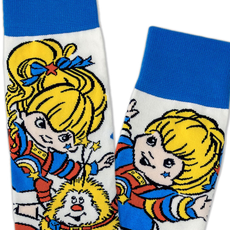 Add a burst of color to your everyday outfits with this charming pair of crew socks featuring Rainbow Brite and her lovable sidekick Twink. Surrounded by red, yellow and blue stars, the classic characters capture the magic and nostalgia of the '80s animated series. Trimmed with yellow, red and blue accents on the toes, heels and cuffs, these bright and cheery socks are sure to banish gloom wherever you wear them.