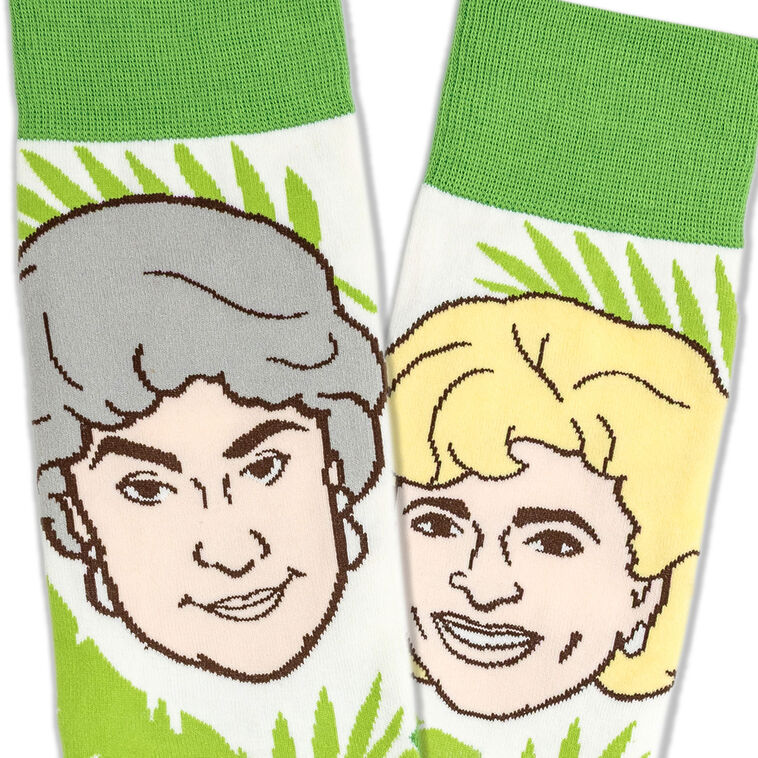 Celebrate friendship, fun style and fierce personalities with this playful pair of novelty socks featuring the faces of "The Golden Girls." Blanche, Sophia, Rose and Dorothy illustrations smile among bright green tropical leaves. And coordinating green accents on the heels, toes, and cuffs evoke the sunny vibrancy of Miami. A cozy and colorful tribute to the beloved TV series, these socks are perfect for fans who love a little sass with their heartwarming style.
